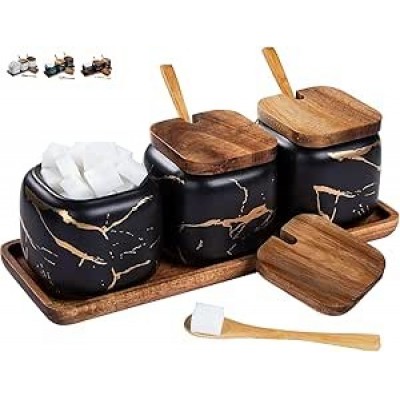 • Especificaciones: El conjunto incluye 3 cajas de azúcar de cerámica, 1 tazón de bambú, 3 tapas de bambú y 3 cucharas en bambú. Portaspecies, Dimensiones: 9 * 9 * 8.7 cm, capacidad total de tres: 1080 ml / 38 oz. Dimensiones de la bandeja de bambú: 29 * 10.5 cm, longitud de la cuchara de bambú: 13 cm.