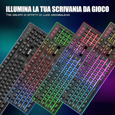 • 【Illumina Tastiera e Mouse】 La tastiera ha tre gruppi integrati di effetti di retroilluminazione arcobaleno, supporta 2 modalità di respirazione, 3 modalità statiche e 4 livelli di luminosità. Il design luminoso di lettere, logo, spazi vuoti e dintorni la rende la migliore tastiera wireless illuminata sul mercato (Nota: non c'è luce circostante nell'angolo in alto a destra a causa della spia luminosa). Il mouse ha un effetto di illuminazione graduale ciclico a 7 colori incorporato.