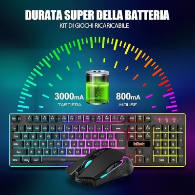 • 【Batteria Ricaricabile e Lunga Durata】 La tastiera è dotata di una batteria da 3000 mAh e il mouse è dotato di una batteria da 800 mAh. La lunga durata della batteria consente di utilizzarli ininterrottamente per 8 ore con la luce. La tastiera e il mouse sono dotati di funzioni intelligenti di risparmio energetico. Se non ci sono operazioni entro 2 minuti, andranno automaticamente a dormire, premere un tasto qualsiasi per svegliarli. Si prega di caricare 8 ore prima dell'uso.
