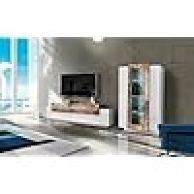 STRUTTURA E UTILIZZO - Mobile per salotto composto da una base porta TV di colore bianco lucido con tre ante con apertura a ribalta e una mobile vetrina a muro: la vetrina pensile è dotata di tre ante battenti di cui quella centrale con dettaglio in vetro - Entrambi i moduli presentano un'anta con dettaglio di colore grigio acero - La vetrina contiene al suo interno sette ripiani di cui tre in vetro temperato con illuminazione - Sistema di illuminazione LED di colore bianco integrato - A seconda delle vostre necessità potrete posizionare il modulo pensile nella posizione che preferite - Lo spazio all'interno delle ante è perfetto per riporre in modo ordinato oggetti o stoviglie in