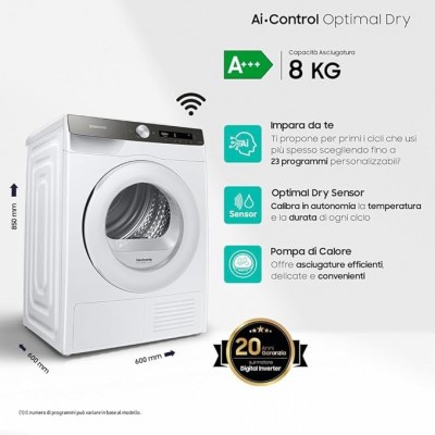 Samsung Dryer AI Control, DV80T5220TT/S3, 8 kg, bomba de calor, wifi, sensor seco óptimo, F