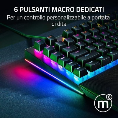 Underglow su 2 lati e illuminazione dei singoli tasti con tecnologia Razer Chroma RGB: Grazie all'illuminazione dei singoli tasti e a un underglow suggestivo che illumina la tastiera da vari angoli, puoi sincronizzare la tua postazione e lasciarti coinvolgere pienamente in una miriade di giochi integrati
