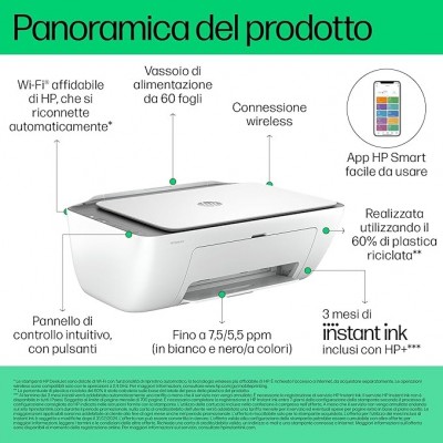 • CONNETTIVITÀ: è possibile stampare da pc, smartphone e tablet con l'app HP Smart che si connette ai dispositivi attraverso il Wireless Dual Band, Wi-Fi Direct, AirPrint e Mopria; Cavo USB non incluso